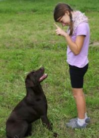 Eventually, you stop using the treat to lure the dog’s eyes toward yours, though you still use the hand signal (fingers to eyes) and give the reward.