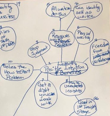 Instead I started with the cluster bubble I was pretty sure would be the first main idea (Bubble 2, Lamott’s Positive Intention & Benefits) and the bubbles immediately connected to Bubble 2 (Bubbles 3 -10 and 16).