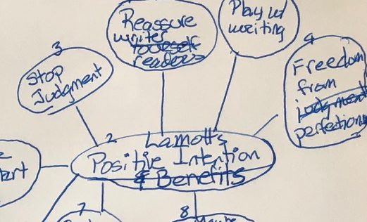 I repeated that process: glance at a bubble, rough-write a sentence or two, sometimes add a quote, and sometimes put words in Lamott’s mouth. I added related ideas as they occurred to me, then looked at the cluster to see what bubble(s) to check mark. I smoothed some of the roughest spots of the new sentences, then moved on.