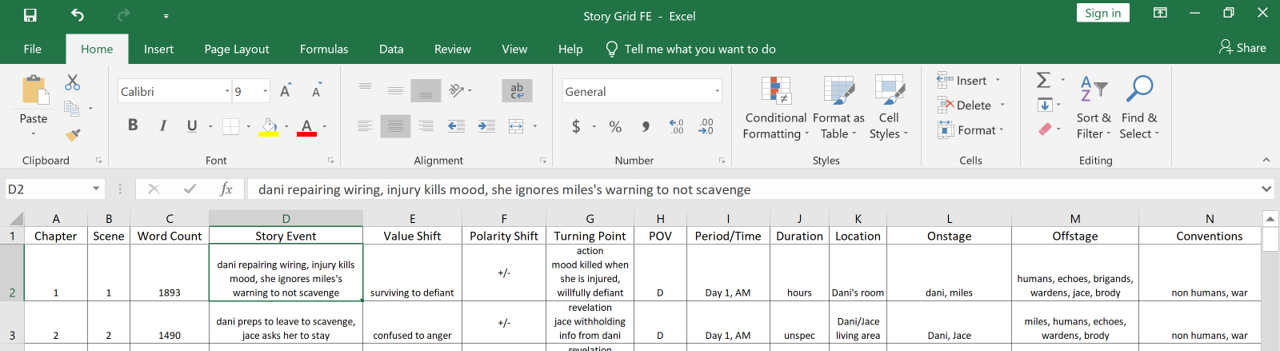 I tried scribbling notes on paper, sticky notes on the wall, and making notes in Word. I learned Story Grid which relies on spreadsheets to record chapters, scenes, scene turning points, POV, and several other details specific to each scene.
