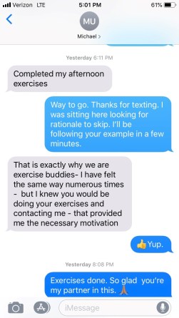 My friend Mike and I became exercise accountability buddies after we both had knee surgery. Every time we did exercises and other things essential to our recovery, we sent a text. Since we both had multiple sessions a day, we had multiple times to acknowledge our progress, e.g. “Completed morning exercises and I’m icing now.”
